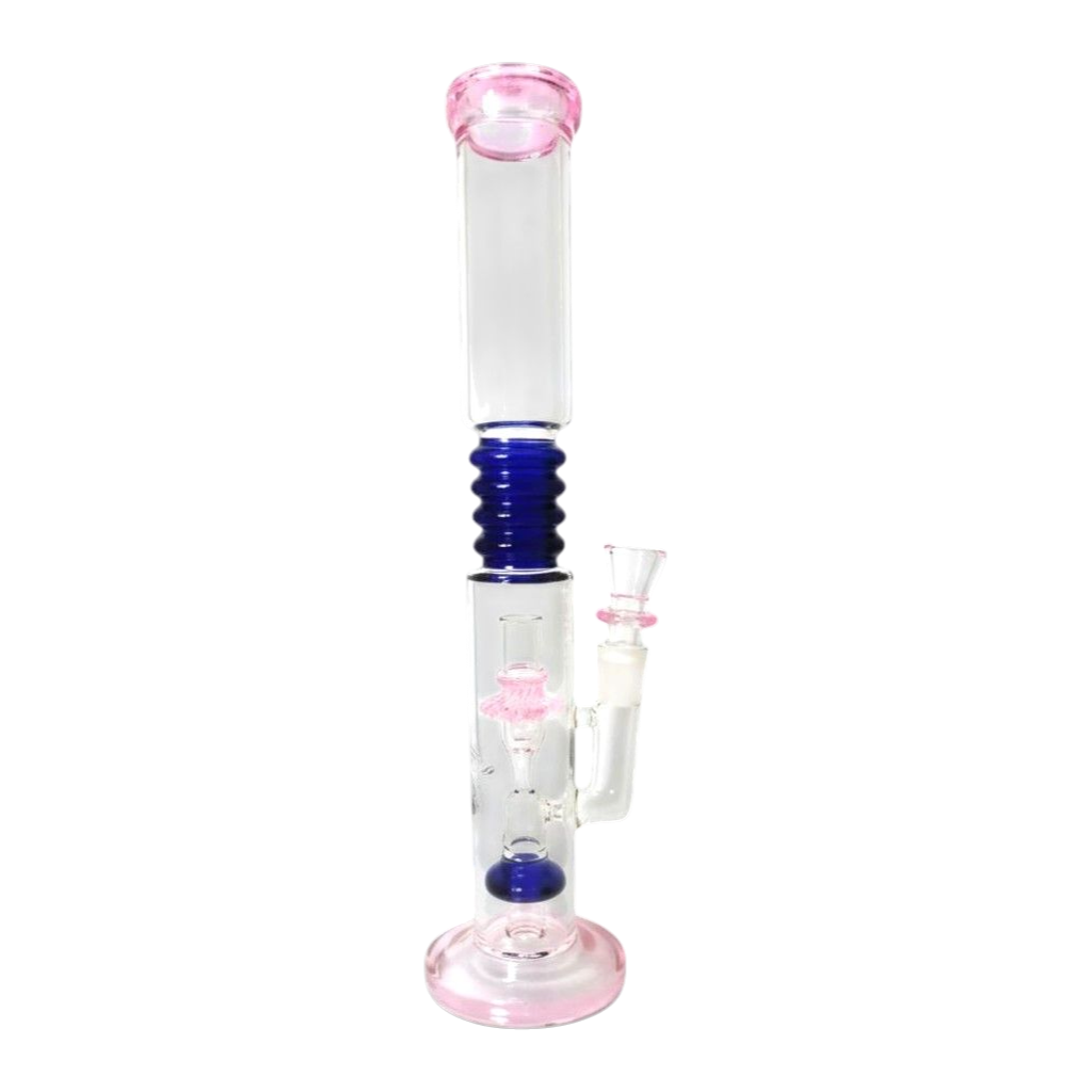 Lleva tus sesiones a lo más alto con el Bong “Caramel” de 41 cm. Esta pieza no solo impresiona por su gran tamaño y sus llamativos acentos en rosa y azul, sino por su potente sistema de doble percolador diseñado para caladas masivas y excepcionalmente suaves.